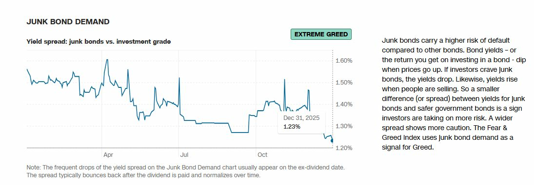 Junk Bond Demand (Extreme Greed): This is the standout. The yield spread between risky junk bonds and safer bonds is only 1.23%, a very low number. When this spread is low, it means investors are so eager to buy risky junk bonds that they're accepting very little extra reward for the risk. Big money is rushing into the riskiest part of the bond market.