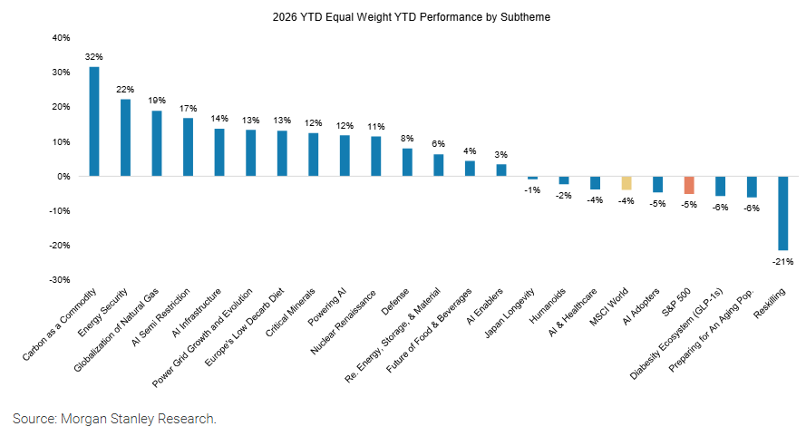Morgan Stanley’s thematic strategy has continued to generate alpha in volatile markets. Thematic baskets rose 38% in 2025 (outperforming the S&P 500 by 27ppt) and are up ~7% YTD 2026 (beating by 12ppt).