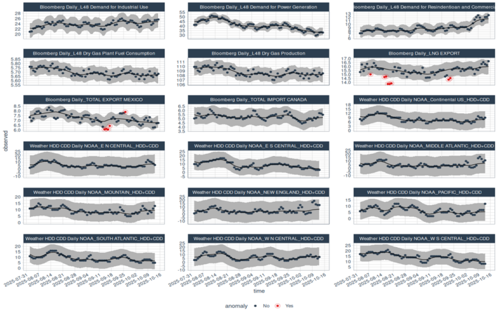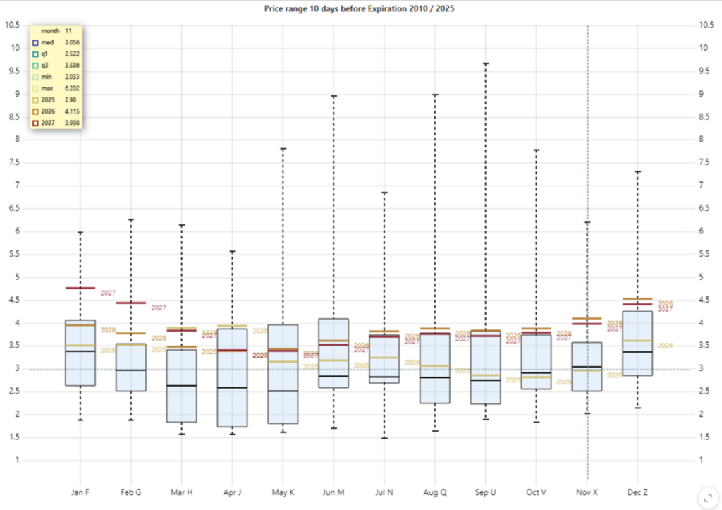 Due to warm weather and high production, the NGX25 contract is trading below its 10-day average and showing increased volatility during this period. Prices for 2026 winter contracts remain above the upper limit of the interquartile range.