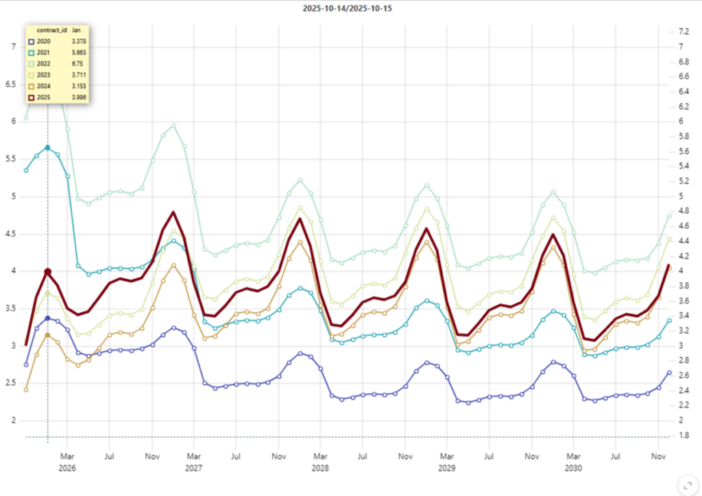 The shape of the forward curve in 2025 shows a steady convergence and is even closer to the configurations recorded in 2023 and 2024 for comparable dates. This trend is particularly evident in contracts with delivery in three years or more, where prices are steadily converging towards historical levels.