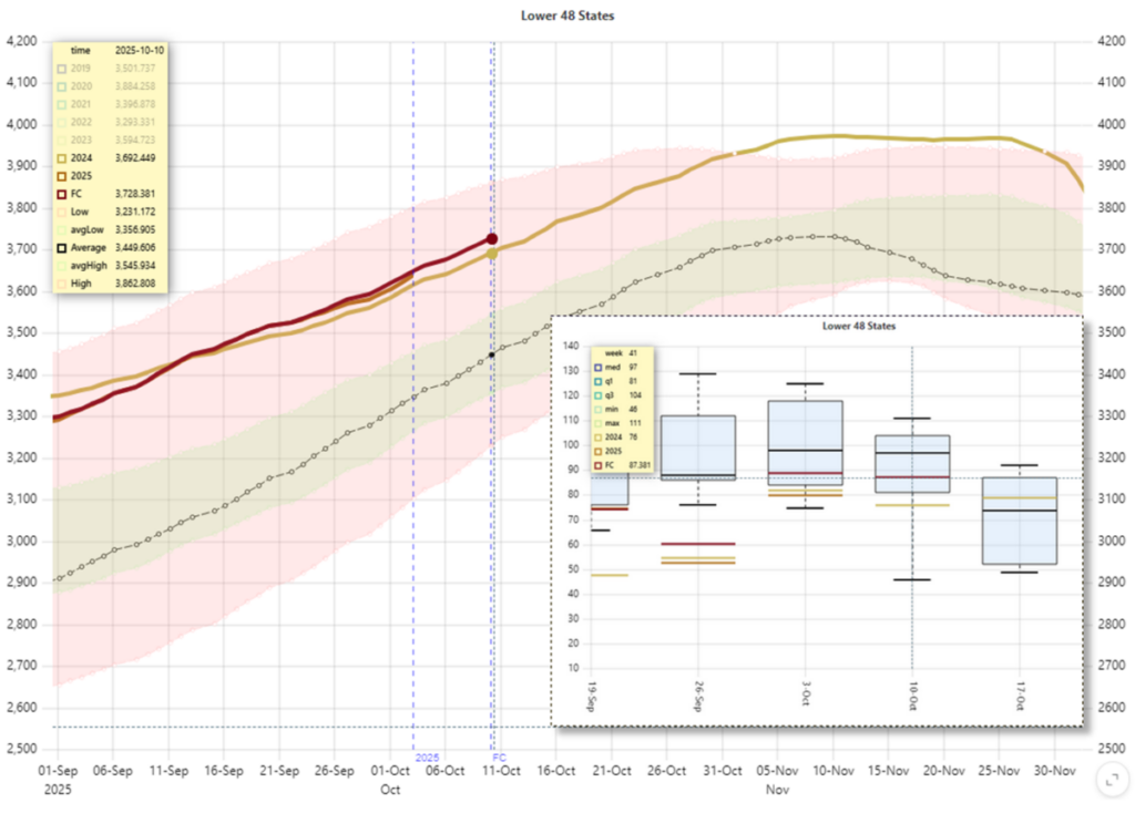 The natural gas market enters Week 42 with a robust storage gain, as reserves are forecast to climb 87 BCF during Week 41 (October 6-12), reaching 3,728 BCF and outpacing last year. The NGX25 contract dips below its 10-day average amid heightened volatility driven by warm weather and high production, while 2026 winter contracts stay above the interquartile range. Mild conditions, with HDD+CDD below historical averages, suppress demand, and a below-average supply-demand gap signals potential oversupply.