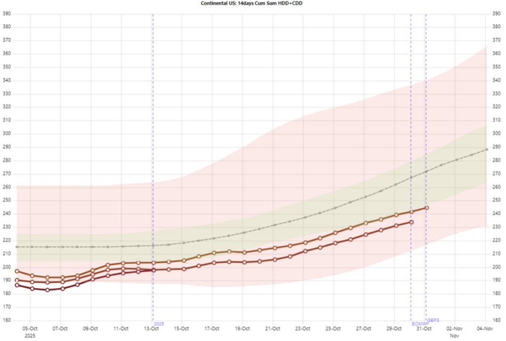 The HDD+CDD accumulated over 14 days for all regions remains below the historical averages for 1994–2024, and even taking into account the forecast for the next two weeks, no significant deviation from the current trend of mild weather is expected.