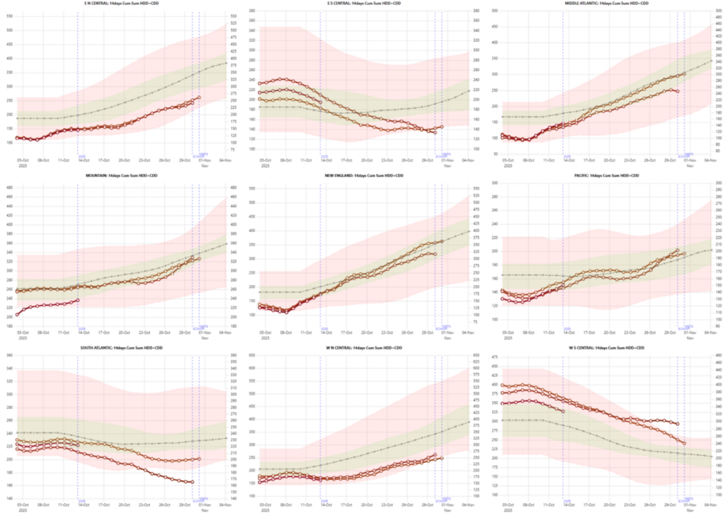 In all regions except WS CENTRAL and PACIFIC, the 14-day cumulative HDD+CDD remains below the historical average for 1994–2024, and the forecast for the next two weeks does not suggest a departure from the current mild weather trend.