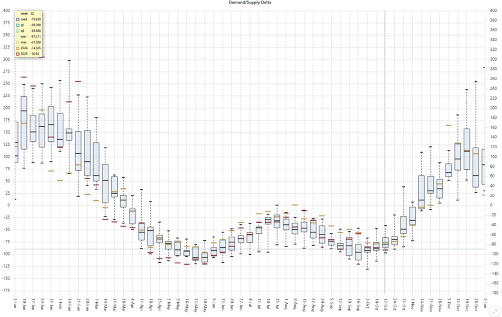 This week, the difference between supply and demand in 2025 is below the average values for 2014–2024, indicating weaker demand or excess supply.