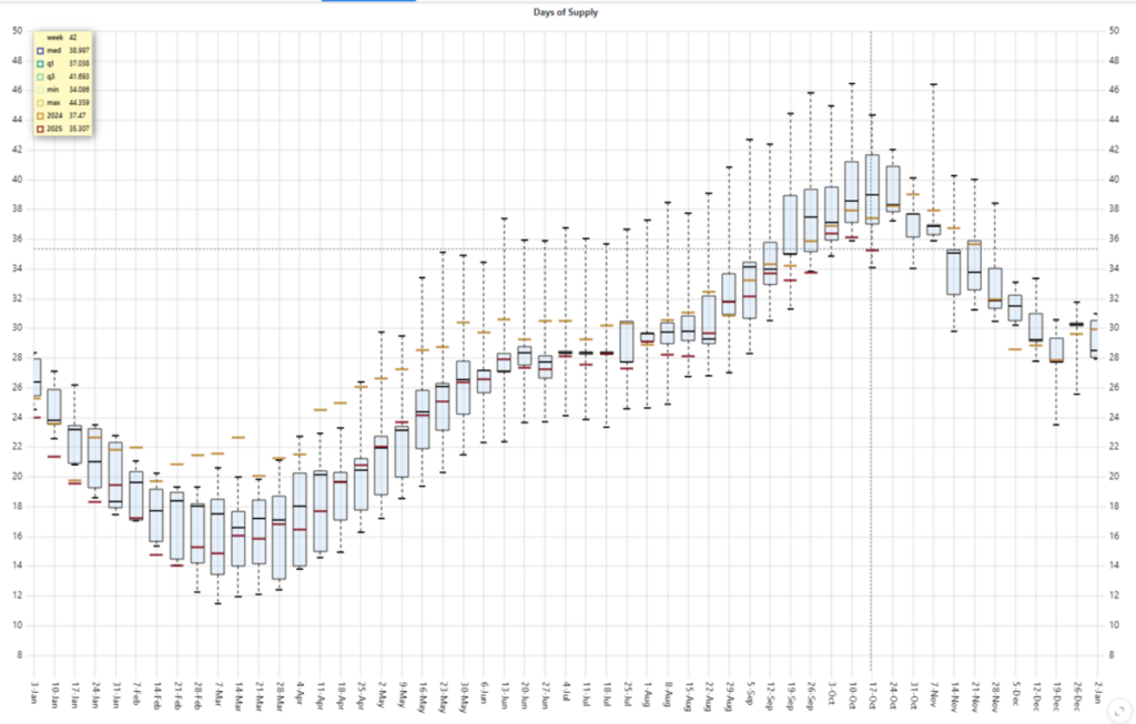 The graph shows the number of days of supply from storage facilities alone, based on current consumption levels. By early October 2025, reserves will last for approximately 35 days, which is below the lower limit of the interquartile range. With such moderate reserves, even minor disruptions in production or spikes in demand could cause sharp price reactions, especially in late winter and early spring.