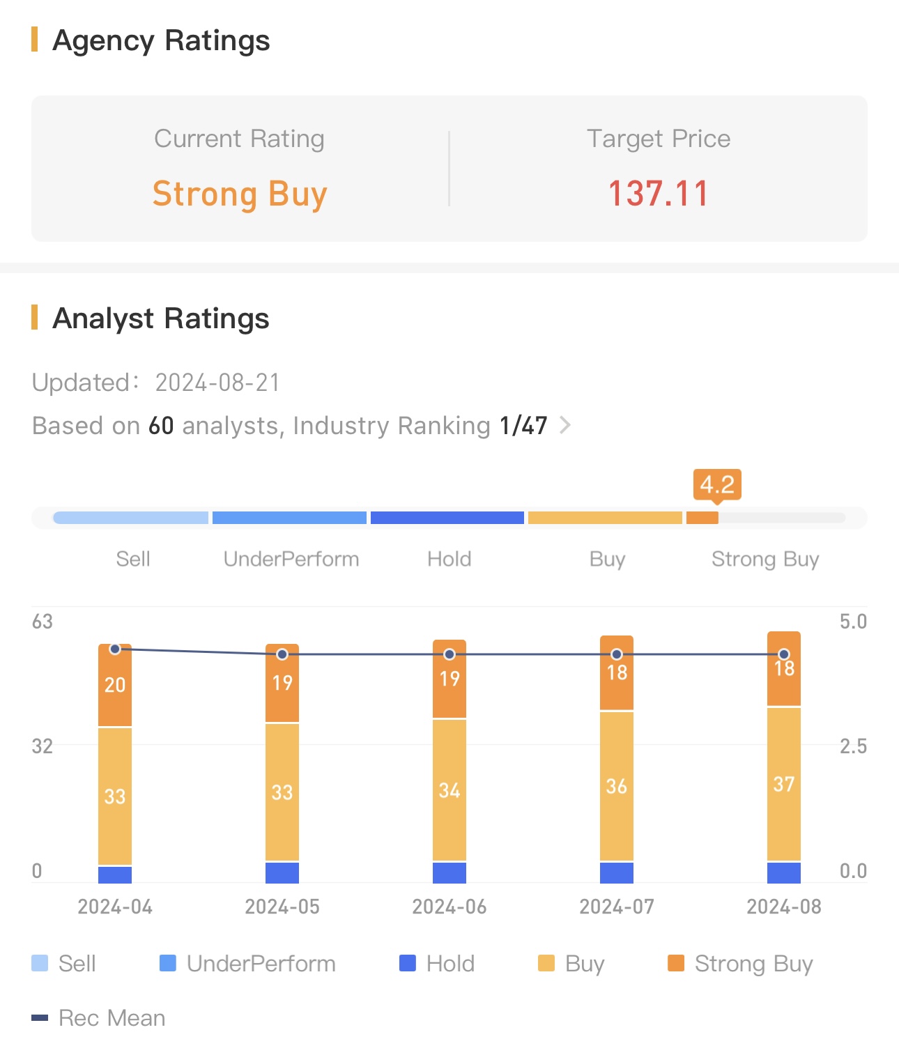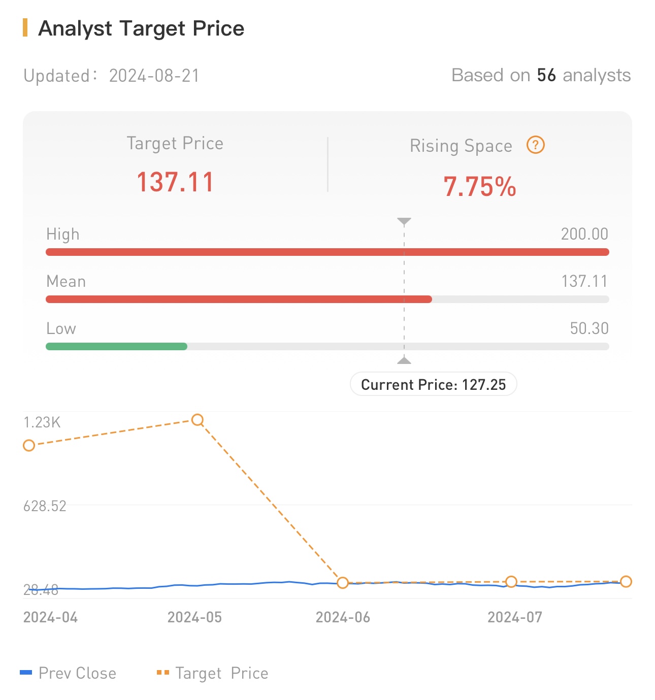 According to Bloomberg analysts, NVIDIA Corporation(NVDA.US)'s Q2 FY2025 revenue is expected to reach $28.69 billion, representing a year-over-year increase of 112%. Adjusted net profit is projected to be $15.9 billion, a 136% year-over-year rise, with earnings per share (EPS) anticipated at $0.60, up 143% from the previous year. Currently, 55 analysts have rated the stock as a "Buy," with an average target price of $137.11.