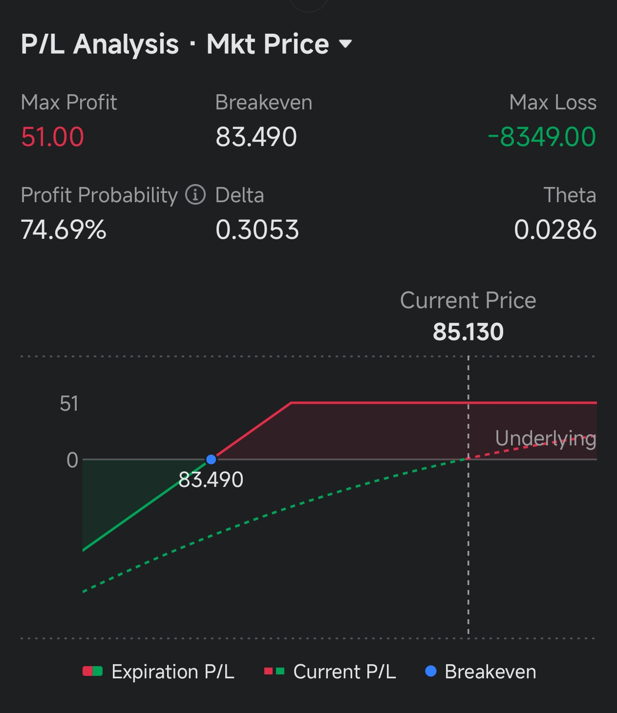 - Breakeven: At $83.49, you're covered (Strike $84 - Premium $0.51).
