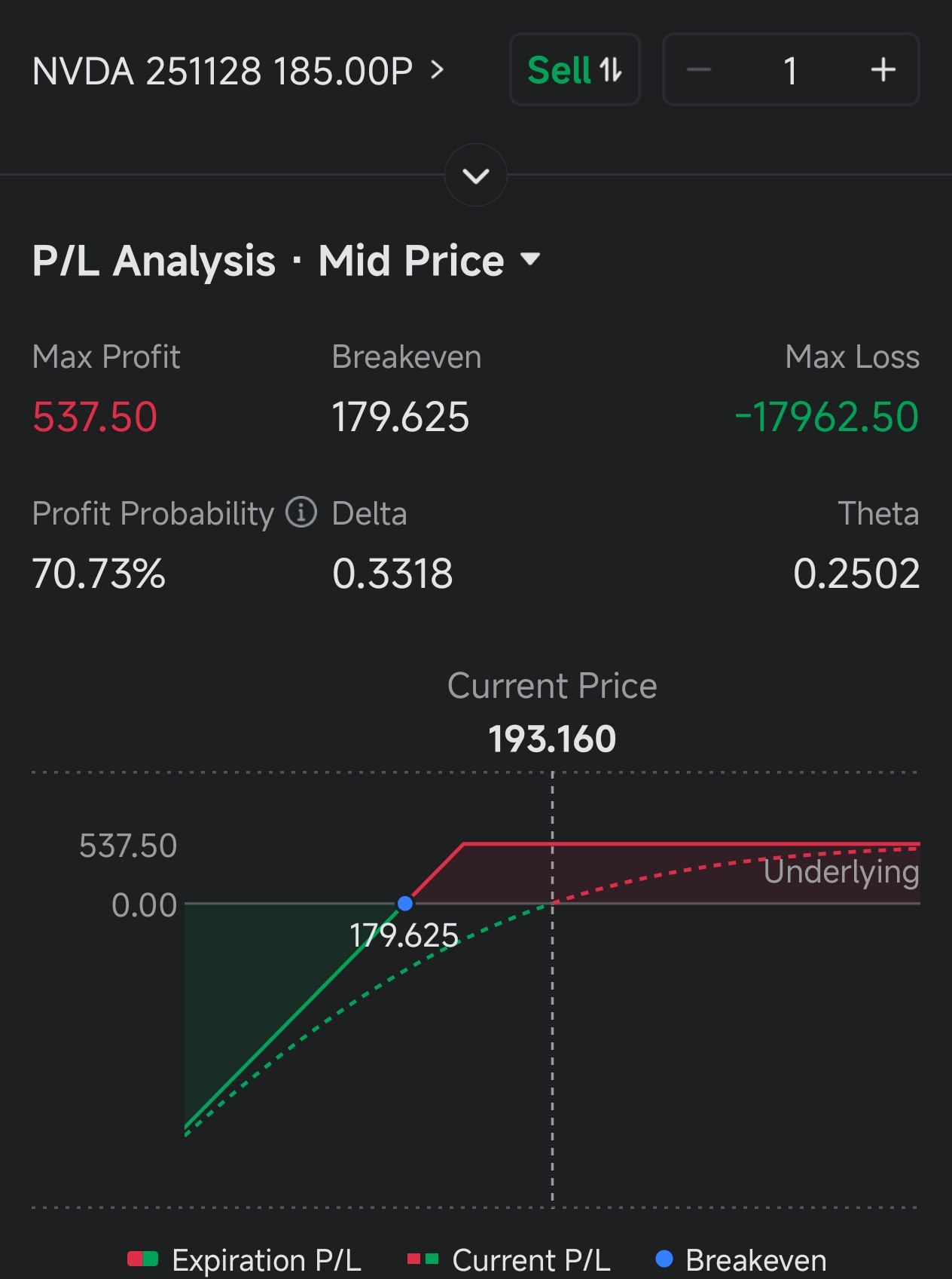 Example: Sell one Put expiring on 251128 with a strike price of $185 (NVDA 281125 P 185), using November 11th data. You start with $537.5 in net income.