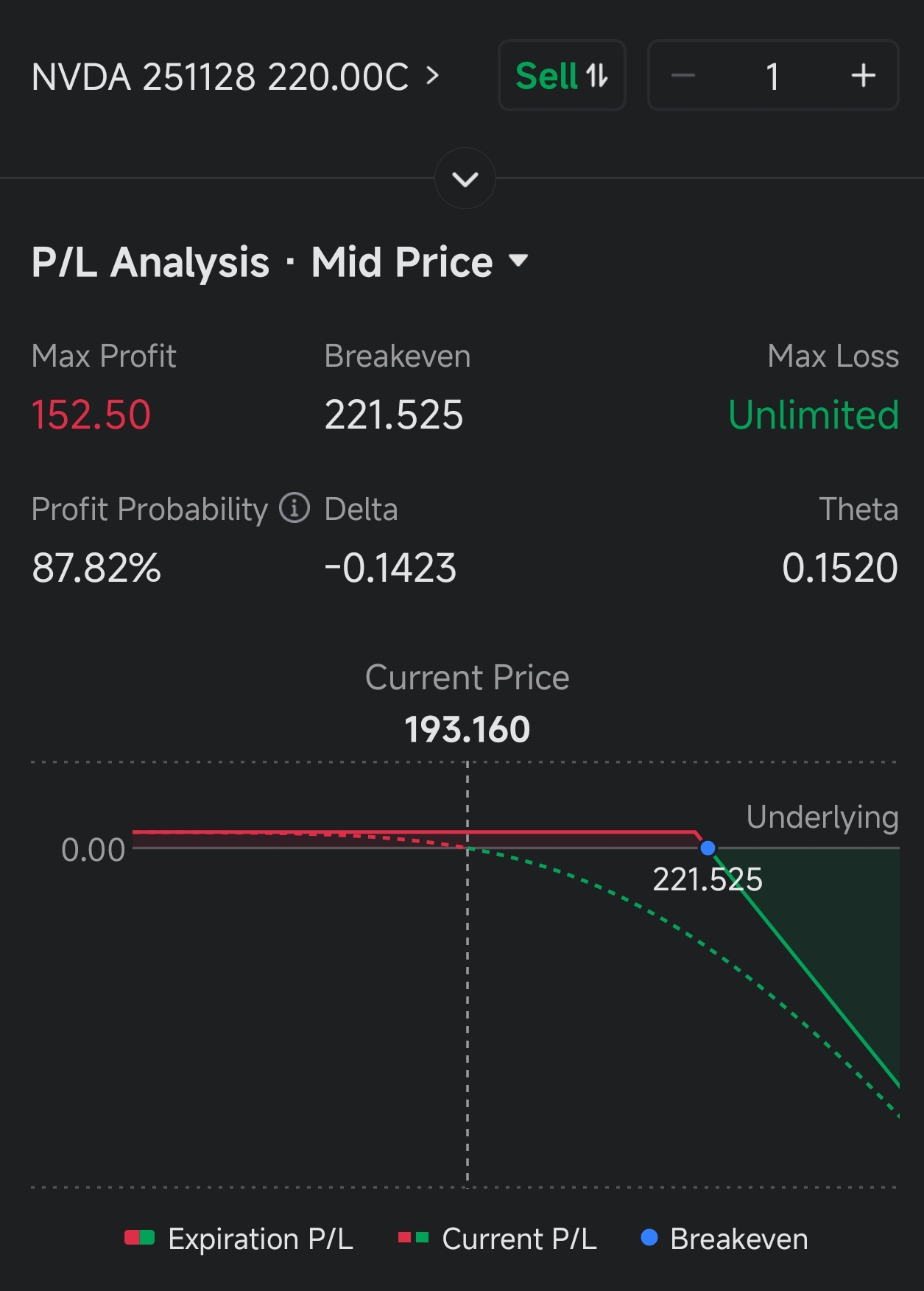 Example: Sell one Call expiring on 251128 with a strike price of $220 (NVDA 281125 C 220), using November 11th data. You start with $152.5 in net income. If you own 100 shares, you don't need extra margin.