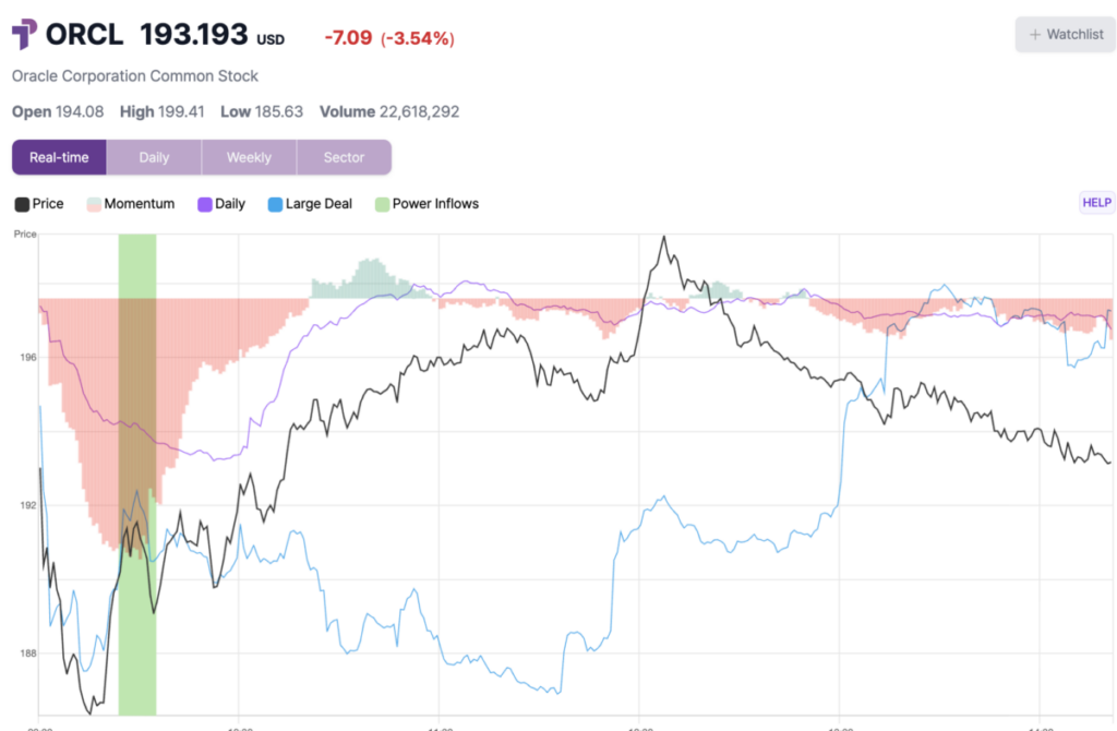Oracle Corporation (NYSE:ORCL) experienced a significant Power Inflow alert, a key bullish indicator that is closely tracked by traders who value order flow analytics, specifically institutional and retail order flow data.