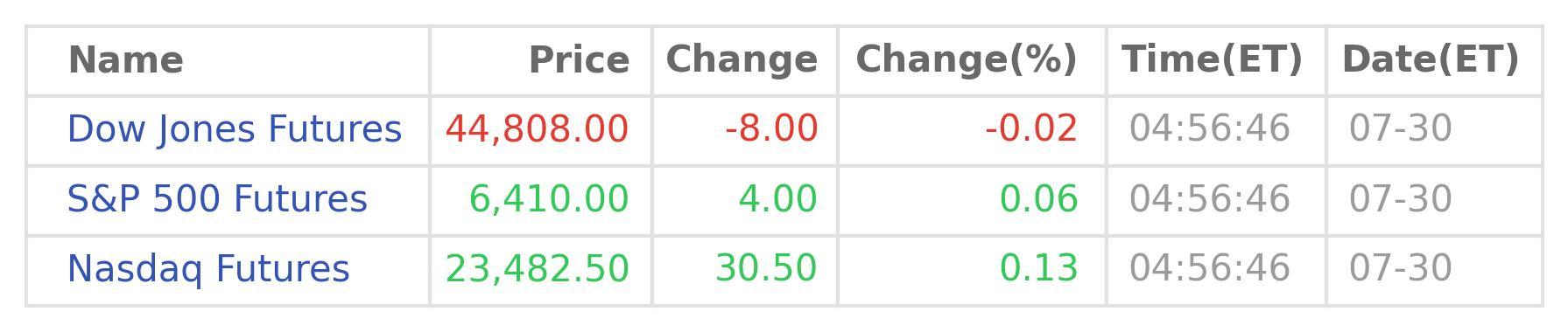 As of 04:56:46 on Jul 30 (ET), compare to the prices at 17:00:00 on the previous trading day, including any holiday-shortened sessions, the blue-chip Dow Jones Futures fall slightly by 8.0 points or 0.02% to 44,808, the broad-based S&P 500 Futures ascend a bit by 4.0 points or 0.06% to 6,410, the tech-heavy Nasdaq Futures rise by 30.5 points or 0.13% to 23,482. (Data source: Wind Quant)