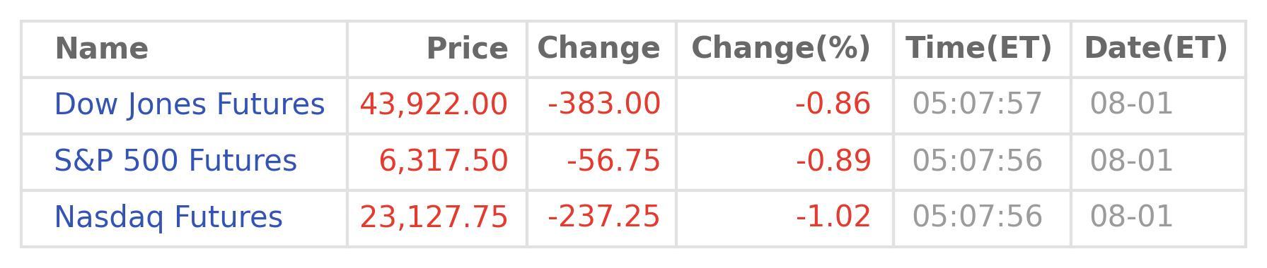 As of 05:07:57 on Aug 01 (ET), compare to the prices at 17:00:00 on the previous trading day, including any holiday-shortened sessions, the blue-chip Dow Jones Futures depreciate by 383.0 points or 0.86% to 43,922, the broad-based S&P 500 Futures fade 56.75 points or 0.89% to 6,318, the tech-heavy Nasdaq Futures deteriorate by 237.25 points or 1.02% to 23,128. (Data source: Wind Quant)