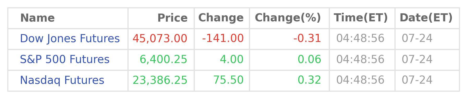 As of 04:48:56 on Jul 24 (ET), compare to the prices at 17:00:00 on the previous trading day, including any holiday-shortened sessions, the blue-chip Dow Jones Futures tick lower by 141.0 points or 0.31% to 45,073, the broad-based S&P 500 Futures are heading slightly up by 4.0 points or 0.06% to 6,400, the tech-heavy Nasdaq Futures edge up by 75.5 points or 0.32% to 23,386. (Data source: Wind Quant)