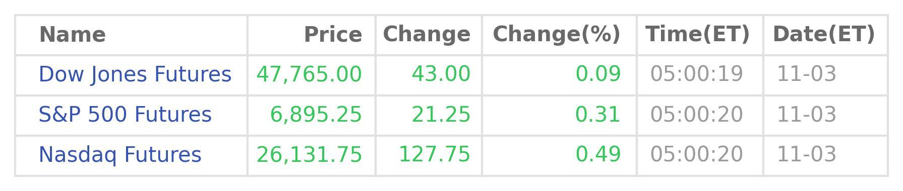 As of 05:00:19 on Nov 03 (ET), compare to the prices at 17:00:00 on the previous trading day, including any holiday-shortened sessions, the blue-chip Dow Jones Futures advance modestly by 43.0 points or 0.09% to 47,765, the broad-based S&P 500 Futures are trading higher by 21.25 points or 0.31% to 6,895, the tech-heavy Nasdaq Futures tick up 127.75 points or 0.49% to 26,132. (Data source: Wind Quant)