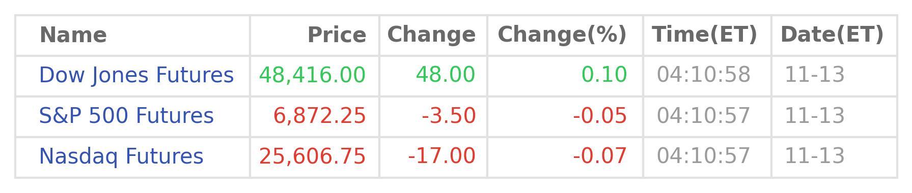 As of 04:10:58 on Nov 13 (ET), compare to the prices at the end of the previous trading day, including any holiday-shortened sessions, the blue-chip Dow Jones Futures tick up 48.0 points or 0.1% to 48,416, the broad-based S&P 500 Futures nudge down by 3.5 points or 0.05% to 6,872, the tech-heavy Nasdaq Futures reduce a bit by 17.0 points or 0.07% to 25,607. (Data source: Wind Quant)