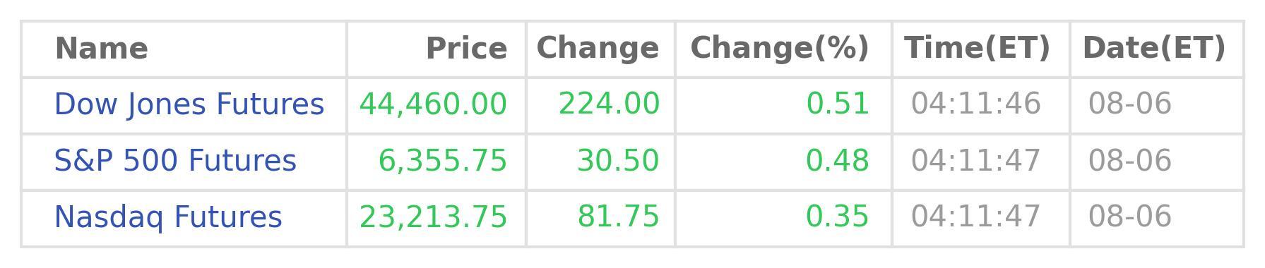 As of 04:11:46 on Aug 06 (ET), compare to the prices at 17:00:00 on the previous trading day, including any holiday-shortened sessions, the blue-chip Dow Jones Futures grow by 224.0 points or 0.51% to 44,460, the broad-based S&P 500 Futures pick up 30.5 points or 0.48% to 6,356, the tech-heavy Nasdaq Futures are moving higher by 81.75 points or 0.35% to 23,214. (Data source: Wind Quant)