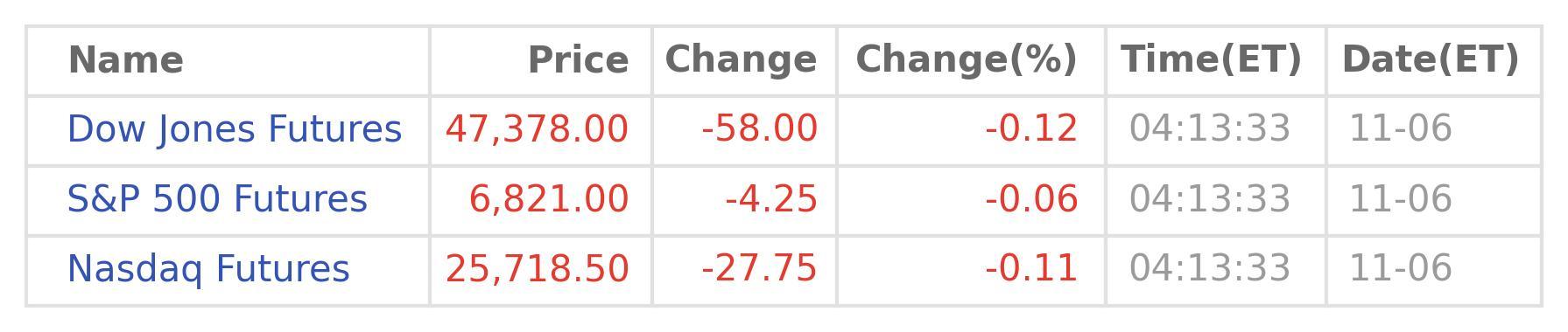 As of 04:13:33 on Nov 06 (ET), compare to the prices at the end of the previous trading day, including any holiday-shortened sessions, the blue-chip Dow Jones Futures contract by 58.0 points or 0.12% to 47,378, the broad-based S&P 500 Futures lose slight momentum by 4.25 points or 0.06% to 6,821, the tech-heavy Nasdaq Futures ebb by 27.75 points or 0.11% to 25,718. (Data source: Wind Quant)