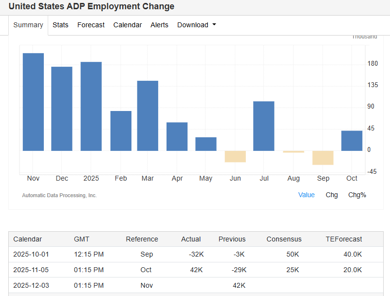 ADP data showed US businesses added 42,000 jobs in October, exceeding expectations.