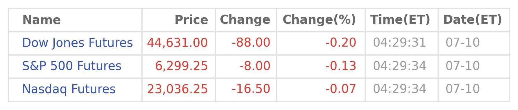 As of 04:29:31 on Jul 10 (ET), compare to the prices at 17:00:00 on the previous trading day, including any holiday-shortened sessions, the blue-chip Dow Jones Futures fade 88.0 points or 0.2% to 44,631, the broad-based S&P 500 Futures deteriorate by 8.0 points or 0.13% to 6,299, the tech-heavy Nasdaq Futures drift by 16.5 points or 0.07% to 23,036. (Data source: Wind Quant)