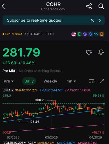 Coherent Corp. COHR | 307.50 304.41 | +8.21% -1.00% Pre |