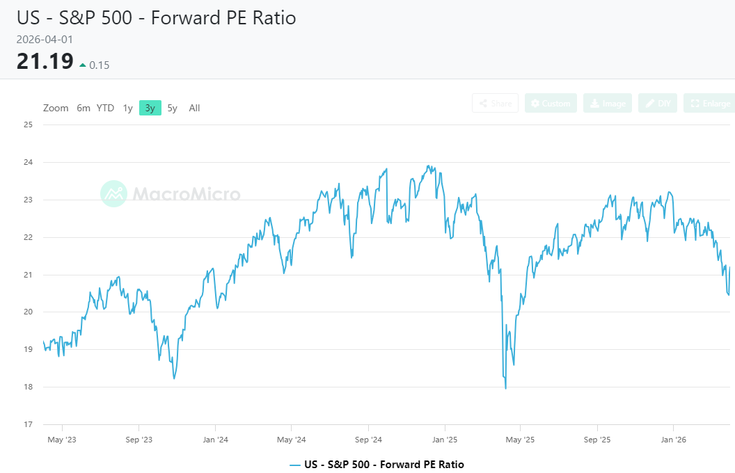 Following the recent pullback, the P/E ratio of the S&P 500 has returned to the level of last May. (Source: macromicro)