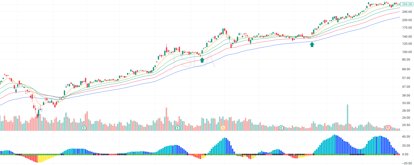 - Stacked EMAs: For a long trade, the moving averages are aligned in order: 8 > 21 > 34 > 55 > 89 EMA.