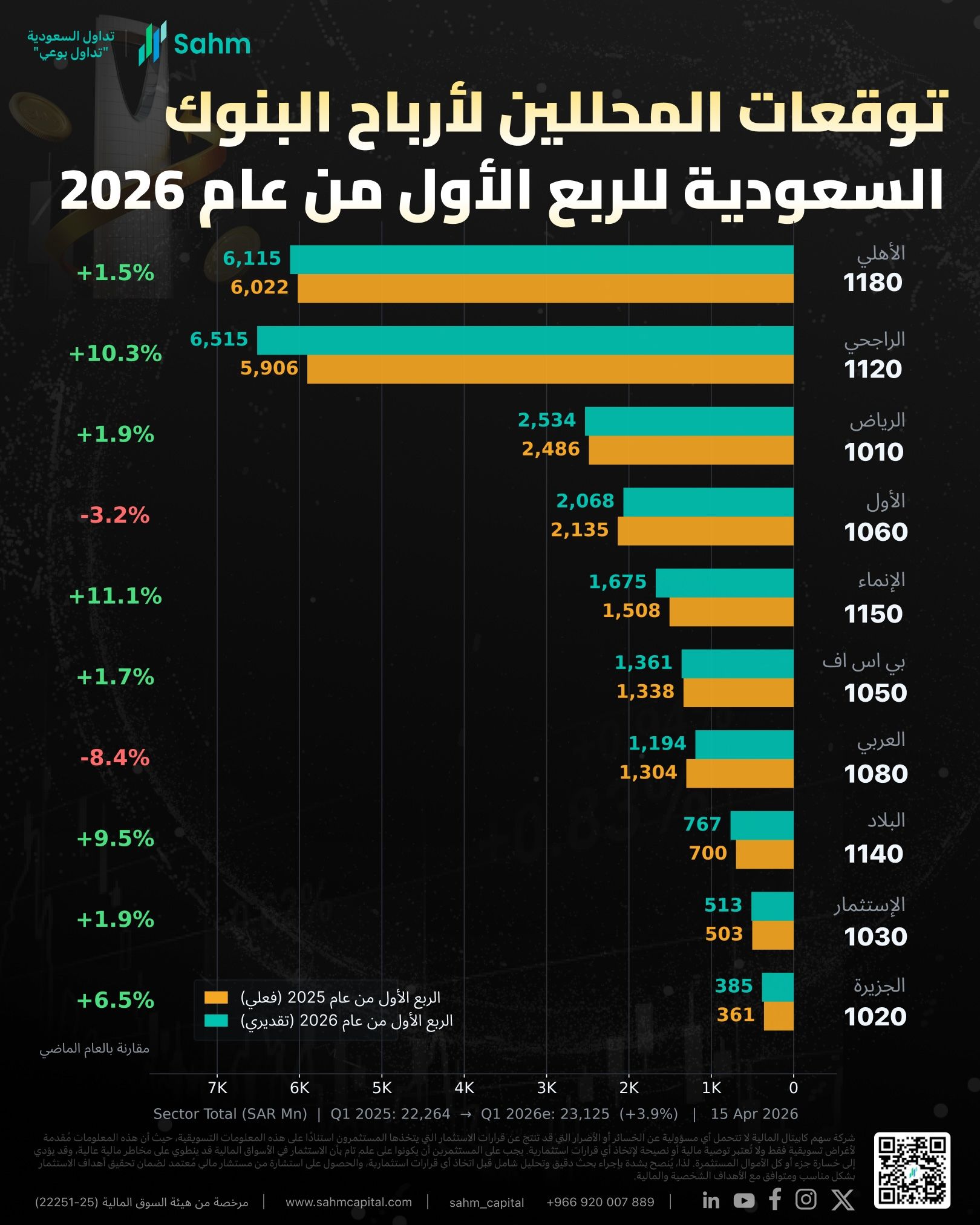 Research firms covering the Saudi banking sector project combined net profit of approximately SAR 23.1 billion for Q1 2026 across the listed banks under coverage. That would represent a 3.9% increase year-on-year (YoY) compared with SAR 22.3 billion in Q1 2025 — a sign that the sector's earnings trajectory remains intact.