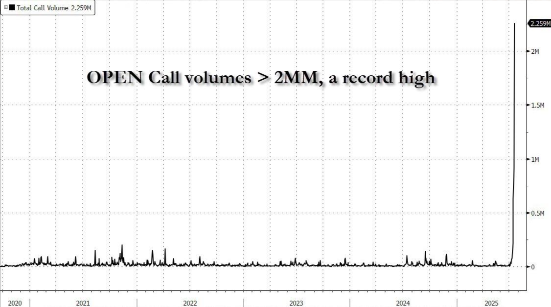 And the truly insane scene wasn't even in the stock itself, but in the options market. As call options exploded higher, a historic gamma squeeze unfolded. As shown in the chart below, Opendoor call option volume exceeded 2 million contracts on Monday, far surpassing any day in the company's history and marking the third-highest single-day call option volume total for any US stock this year.