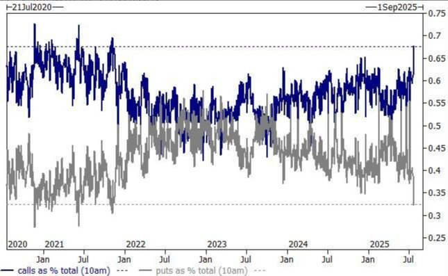 Meanwhile, a Goldman Sachs derivatives strategist stated they are "starting to feel the vibe of 2021" because the market seems very "chasey": "Call option volume is nearly 70% of total market volume (observed at 10am ET Monday)... This ratio hasn't been this high since the meme frenzy of 2021."