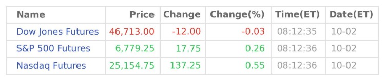 US stock futures mixed Thursday; S&P 500 index(SPX.US) hit a new high as investors shrugged off the US government shutdown. S&P 500 futures rose 0.3%, Nasdaq 100 climbed 0.6%, while Dow Jones futures fell 0.04%.
