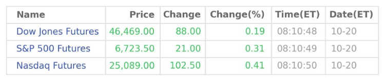 US stock index futures climbed pre-market Monday, with Wall Street anticipating key earnings reports and processing inflation data amid the ongoing US government shutdown.