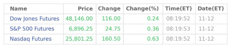 As of 04:19 PM Riyadh time, compare to the prices at the end of the previous trading day, including any holiday-shortened sessions, the blue-chip Dow Jones Futures escalate by 116.0 points or 0.24% to 48,146, the broad-based S&P 500 Futures advance by 24.75 points or 0.36% to 6,896, the tech-heavy Nasdaq Futures improve by 160.5 points or 0.63% to 25,801. (Data source: Wind Quant)