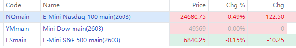 Crude oil prices rose due to Iranian military drills, lifting US oil stocks pre-market: Murphy Oil Corporation(MUR.US), EOG Resources, Inc.(EOG.US), and Occidental Petroleum Corporation(OXY.US) gained over 1%. Gold prices fell on Trump's negotiation signals, dragging gold stocks down: Harmony Gold Mining Co. Ltd. Sponsored ADR(HMY.US) dropped over 4%, Coeur Mining, Inc.(CDE.US) fell more than 3%, and Newmont Corporation(NEM.US) slipped nearly 3%. Storage stocks also declined, with Micron Technology, Inc.(MU.US) and Sandisk Corporation(SNDK.US) losing over 2%, and Western Digital Corporation(WDC.US) and Seagate Technology Holdings PLC(STX.US) down over 1%.