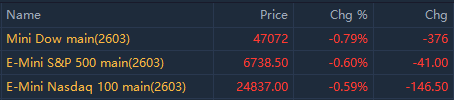 As of 08:28 EST (or 3:28 PM in Riyadh), the broad-based S&P 500 Futures fade 41.0 points or 0.60% to 6,738, the tech-heavy Nasdaq Futures are trading lower by 146.5 points or 0.57% to 24,837, the blue-chip Dow Jones Futures weaken 376.0 points or 0.79% to 47,072.