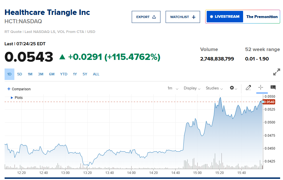 Shares of Healthcare Triangle Inc. opened up as much as 138% and closed 115% higher. However, there was no apparent positive catalyst to explain this astonishing surge.