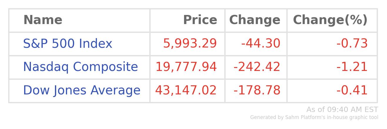 As of 09:40 AM, EST (or 05:40 PM in Riyadh), the broad-based S&P 500 index(SPX.US) ebbs by 44 points or 0.73% to 5,993, the tech-heavy NASDAQ(IXIC.US) deflates by 242 points or 1.21% to 19,778, and the blue-chip Dow Jones Industrial Average(DJI.US) shrinks by 179 points or 0.41% to 43,147.