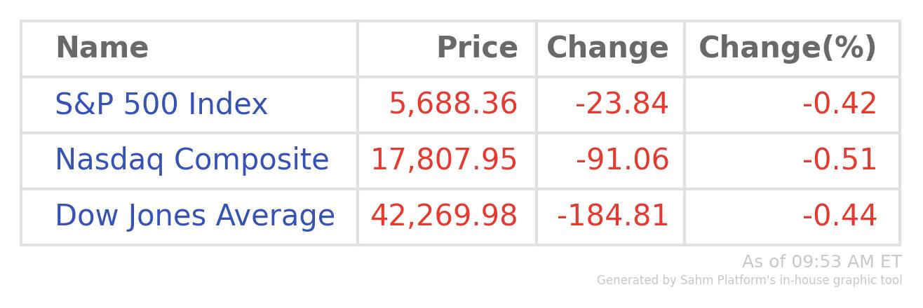As of 09:53 AM, ET (or 04:53 PM in Riyadh), the broad-based S&P 500 INDEX(SPX.US) fades 24 points or 0.42% to 5,688, the tech-heavy NASDAQ(IXIC.US) recedes by 91 points or 0.51% to 17,808, and the blue-chip Dow Jones Industrial Average(DJI.US) deteriorates by 185 points or 0.44% to 42,270.
