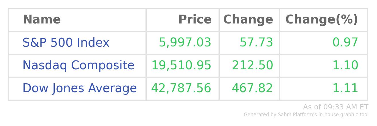 Note: As of 09:33 AM, ET, or 04:33 PM in Riyadh, the broad-based S&P 500 index(SPX.US) appreciates by 58 points or 0.97% to 5,997, the tech-heavy NASDAQ(IXIC.US) heads vastly up by 212 points or 1.1% to 19,511, and the blue-chip Dow Jones Industrial Average(DJI.US) jumps by 468 points or 1.11% to 42,788.
