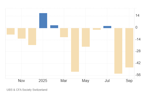 The tariff war with the US has impacted economic sentiment in Switzerland. The rating has remained negative for nine of the past 12 months, up to September. Consumer sentiment was negative over the entire 12-month period, with a reading of 37 in September, although slightly higher than the four-month low of 40 in August.