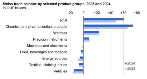Switzerland's top four exports include chemicals and pharmaceuticals, machines and electronics, watches and precision instruments, according to data from the Federal Office for Customs and Border Security. Branded and patented pharmaceutical products are subject to 100% tariffs upon entry into the U.S., unless their manufacturers have or are building production facilities in the U.S.