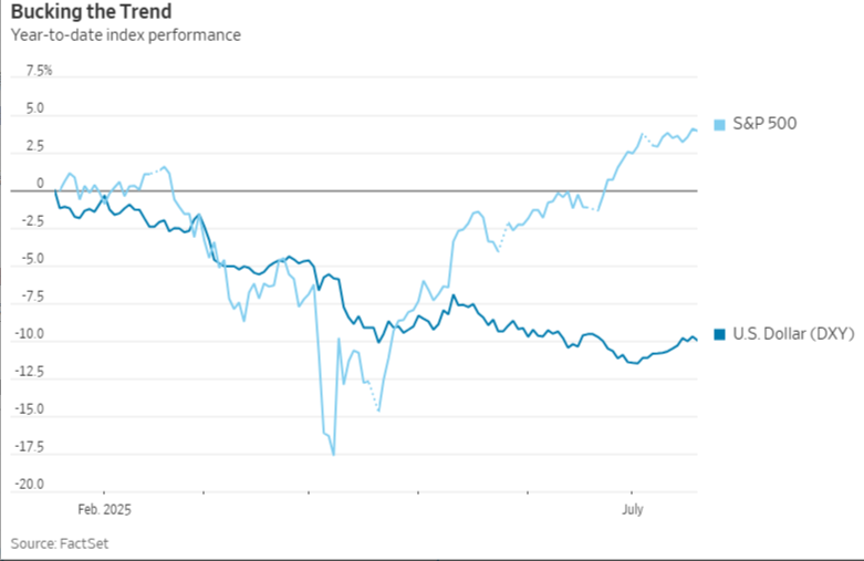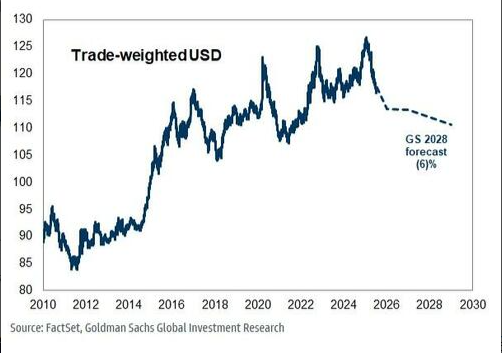 Regarding the dollar exchange rate, Flood points out that the trade-weighted dollar index has depreciated 7% year-to-date, and Goldman Sachs forecasts a further 4% depreciation by year-end.