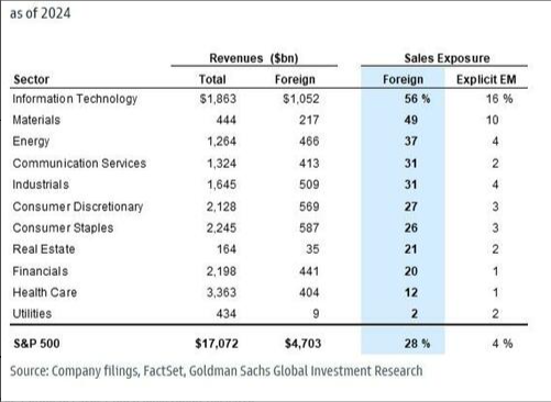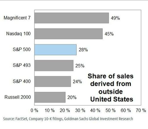 John Flood, Chief Equity Trader at Goldman Sachs (Goldman Sachs Group, Inc.(GS.US)), addressed this in a recent report. The report notes that, based on company 10-K filings, international sales currently account for about 28% of S&P 500 company revenue. This is higher than the international sales exposure in the Russell 2000 (Russell 2000 ETF(IWM.US)) (20%), but lower than the Nasdaq 100 (NASDAQ(IXIC.US)) (45%).