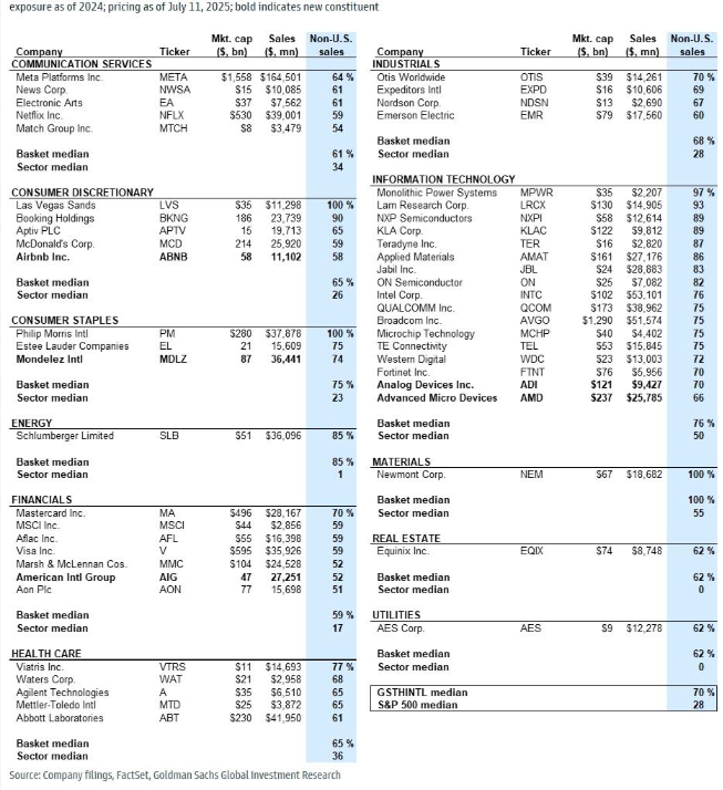 Goldman Sachs also previously compiled a "High International Sales" basket index (GSTHINTL). This index, based on 2024 company filings, selects 50 S&P 500 companies with the highest percentage of international revenue across 11 sectors, as shown in the chart below: