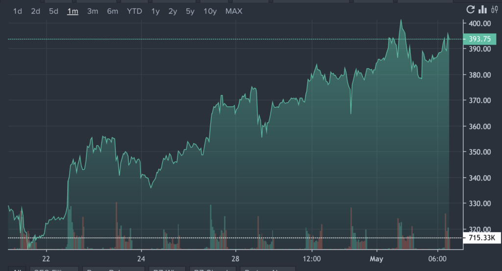 MSTR Price Action: Microstrategy shares were up 3.63% at $395.47 at the time of writing, according to Benzinga Pro.