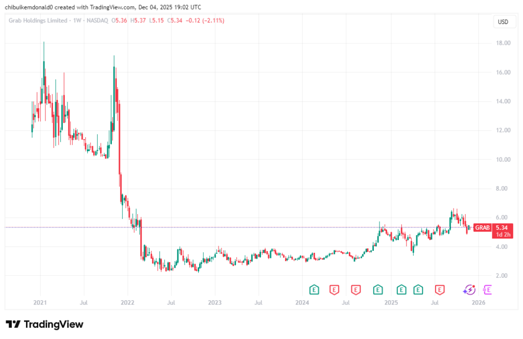Grab shares are holding steady around $5.30, with a market cap of about $21.5 billion. Over the past year, the stock swung between a low of $3.36 in April 2025 and a high of $6.62 in September showing real ups and downs but bouncing back strong, up roughly 32% year-to-date. This recovery comes from better financial performance and new partnerships, like teaming up with May Mobility to bring self-driving cars to Southeast Asia.