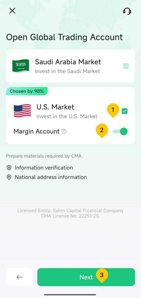 2. Select the type of account you want to open. You can opt for either Saudi securities or U.S. securities account or both. Additionally, select whether you want a margin account.