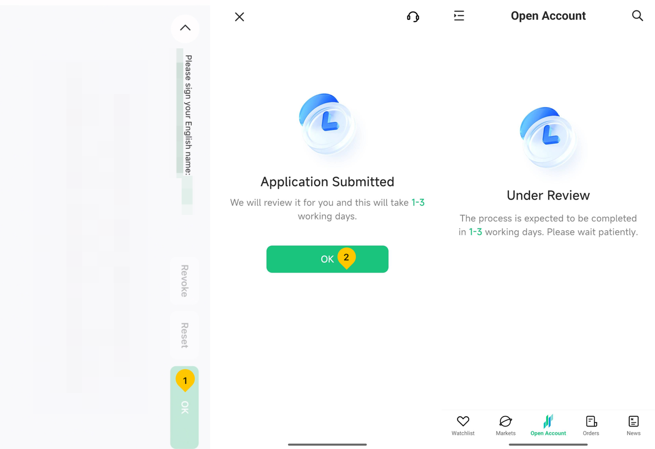 9. Sign your name electronically on the provided space. Confirm the signature by tapping "OK" to finalize the account opening process.